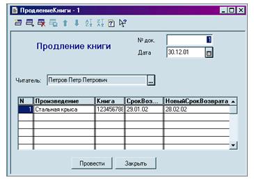 Документ "Продление книги" Экранная форма документа выглядит следующим образом: