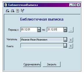 Отчет "Библиотечная выписка" Экранная форма диалога отчета выглядит следующим образом: