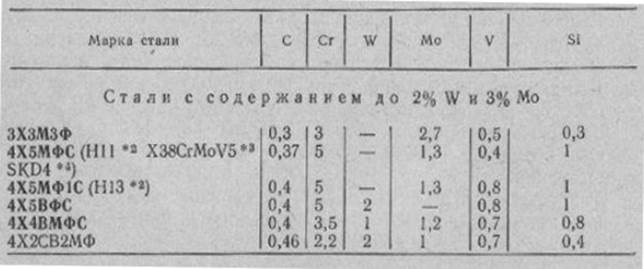 СтальЗХЗМЗФ, содержащая меньше углерода, имеет удовлетворительную вязкость и разгаростойкость; она используется для штампов быстроходных прессов при работе с интенсивным охлаждением. Стойкость пуансонов в этих условиях деформирования на 20—30% выше, чем из стали 4Х5В2ФС, и почти в 2 раза выше, чем из вольфрамовой стали ЗХ2В8Ф 1267. Стали 4Х5МФС и 4Х4М2ВФС являются основными для разнообразных штампов деформирования стали и цветных металлов и для форм литья под давлением алюминиевых и магниевых сплавов диаметром (стороной) до 70—80 мм. Разгаростойкость этих сталей значительно лучше, чем у широко применявшейся ранее вольфрамовой стали ЗХ2В8Ф. Кроме того, из-за влияния повышенного содержания хрома, взаимодействие с заливаемым металлом и растворимость в нем у стали 4Х5МФС (как и стали 4Х5В2ФС) меньше, чем у более легированной стали ЗХ2В8Ф. [2] Таблица 5 Влияние состава и твердости штамповой стали на потерю массы в расплавленном силумине (700 С, 3ч.).