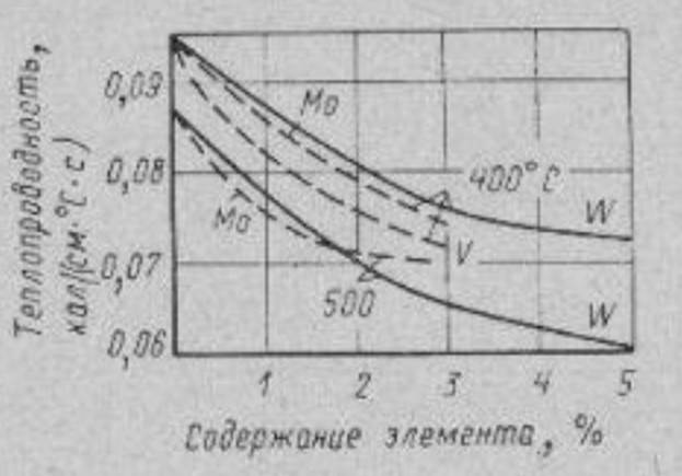 Больше различия этих сталей в вязкости разгаростойкости и в износостойкости при повышенных температурах. СТАЛИ С СОДЕРЖАНИЕМ до 2% W и 3% Мо Теплостойкость сталей (для твердости, HRC 45) составляет 590—610° С. В их карбидной фазе значительнее доля карбида МгзСв при меньшем общем количестве карбидов, чем у рассматриваемых ниже сталей, содержащих больше вольфрама и молибдена. Механические свойства сталей приведены в табл. 110. Они могут немного отклоняться от указанных в ней и на рис. 305 при изменении содержания углерода в пределах марки. Таким же образом они различаются по механическим свойствам, указанным разными авторами. Более высокие вязкость и разгаростойкость имеют стали, легированные молибденом из-за особенностей его влияния на пограничные слои зерна. Кроме того, теплопроводность молибденовых сталей несколько больше, чем вольфрамовых. [2] Рисунок 4 Влияние вольфрама и молибдена на теплопроводность стали с 0,3 % С и 1,5 % Сr при нагреве