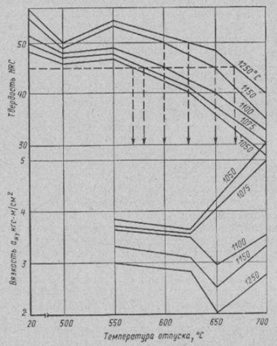 Рисунок 5 Твердость и вязкость стали ЗХ2В8Ф в зависимости от температуры закалки и отпуска