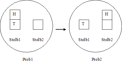 Проблемная ситуация — положение и состав всех трех столбиков. Разрешенные ходы — перемещения верхнего кубика. Будем задавать состояния как список столбиков, столбики — как список символов, голова списка — верхний кубик. Начальное состояние: [[‘c’,’a’,’b’]],[],[]]. Целевое состояние: end(Prob):- member([’a’,’b’,’c’],Prob). Теперь можно определить правила возможных переходов из состояния в состояние. Ранее мы всегда предполагали, что граф задан явным образом. Но в задачах ИИ граф пространства состояний нам не известен, так как пространство состояний имеет астрономические размеры или даже бесконечно. Поэтому для каждого текущего состояния состояния-преемники будут вычисляться с помощью правила go(Prob1,Prob2). В Prob1 имеются два столбика Stolb1 и Stolb2 такие, что верхний кубик из Stolb1 можно поставить на Stolb2 (рис. 1):