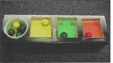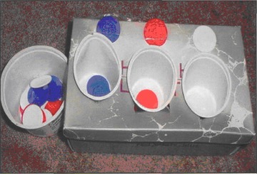 МАТЕРИАЛЫ: - фишки 3-х цветов - контейнер для хранения фишек - чашки для сортировки - коробка с отверстиями для стаканчиков и фишками для примера над каждым стаканчиком
