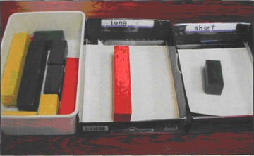 МАТЕРИАЛЫ: - блоки двух различных длин, длинные и короткие - контейнер для смешанных блоков - 2 контейнера для сортировки с пометками «длинный» и «короткий»
