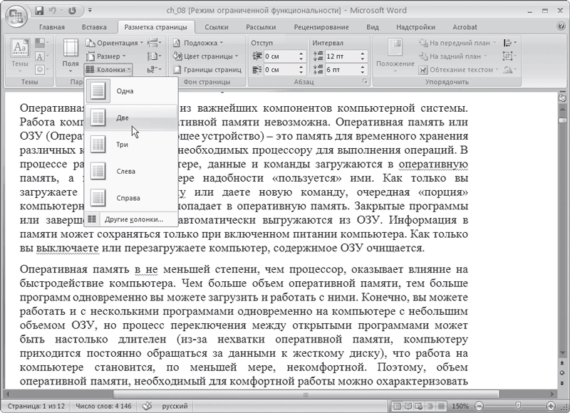 Иногда для удобства чтения текст нужно не только выровнять по левому или правому краю, по центру либо по ширине, но и разбить на колонки, как это делается в газетах или журналах. Это тоже просто. Для этого предназначена кнопка Колонки группы Параметры страницы вкладки Разметка страницы (рис. 12.14).