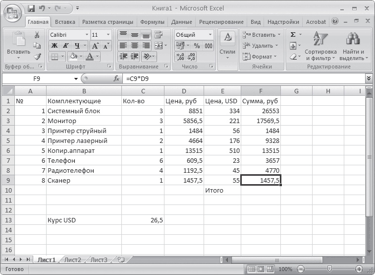 Вы вручную ввели данные и выровняли колонки, но это можно было сделать и в Word. Теперь следует изучить специфические возможности Excel. В ячейках Excel можно размещать не только числа и текст, но и формулы. В этом случае в ячейке будет виден результат вычисления, а сама формула будет отображаться только в строке ввода. Это удобно тем, что результат вычисления обновляется автоматически при изменении исходных данных. Например, в таблице содержатся данные о ценах товаров в рублях и долларах. Причем в долларовые ячейки цена вводится вручную, а в рублевых вычисляется с помощью формулы на основе текущего курса валют. При изменении курса валют достаточно указать новое отношение рубля к доллару – рублевые цены в таблице обновятся автоматически. В видеоролике «Урок 13.3. Работа с формулами» продемонстрировано применение формул в программе Excel 2007. Ввод формулы надо начинать со знака равенства. Пример простейшего вычисления – арифметические действия с содержимым нескольких ячеек. Вернемся к задаче, описанной выше. Как вы помните, есть цена комплектующих и их количество. Вычислим сумму отдельно по каждой позиции. Для этого цену одной позиции списка нужно умножить на количество. Активизируйте соответствующую ячейку (F2) и в строке формул введите выражение: =С2*D2, то есть содержимое ячейки с координатами C2 (это количество единиц первой позиции комплектующих) умножить на содержимое ячейки с координатами D2 (рублевая цена позиции). Результат располагается в активной ячейке (F2), а саму формулу вы видите в строке ввода (рис. 13.2). При необходимости изменить формулу это удобно сделать с помощью мыши именно в строке ввода. Простые формулы, как приведенная выше, проще переписать заново в активной ячейке.