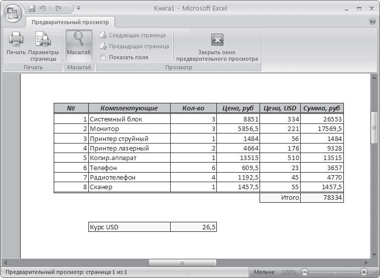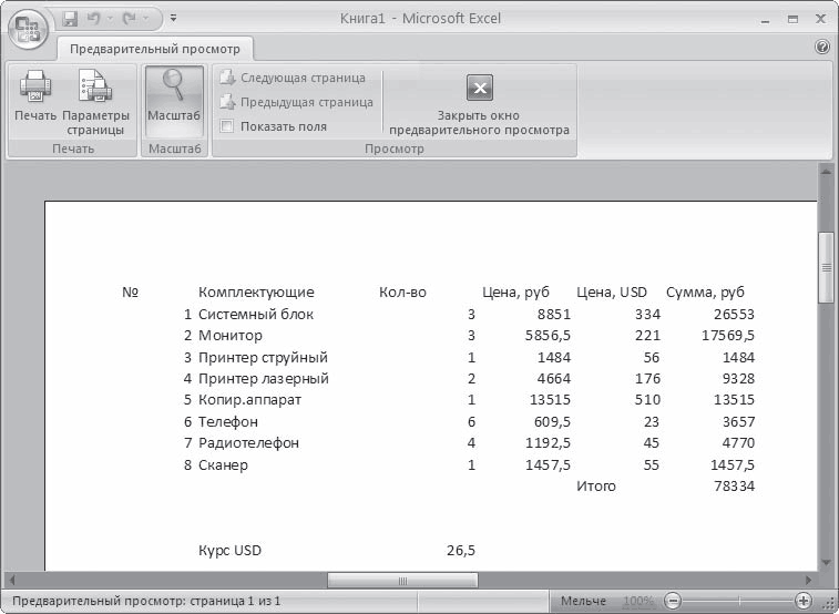 Завершающая операция практически любой задачи – вывод на печать. Кажется, что здесь все просто – нажать кнопку и получить распечатку. Это верно только отчасти. Распечатку вы получите, но увидите на ней совсем не то, что ожидали: вместо аккуратно расчерченного поля таблицы – без рамки и не сопоставляемые друг с другом данные (рис. 13.5), часть которых перешла на вторую страницу, хотя первая выглядит полупустой. Исправим ситуацию.