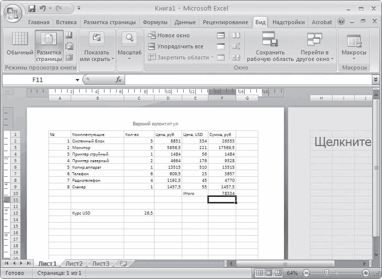 В видеоролике «Урок 13.5. Подготовка документа к печати» продемонстрированы основные настройки перед выводом документа на печать в программе Excel 2007. Прежде всего, вспомните, что Excel – это программа для вычислений, в первую очередь – бухгалтерская, поэтому отличается педантизмом. Все, что в ней необходимо получить, нужно предварительно правильно запросить. В частности, запрос распечатки следует подготовить детально, а не используя установки по умолчанию. По умолчанию была установлена вертикально ориентированная страница (Книжная), а ширина таблицы оказалась больше, чем ширина такой страницы. Кстати, на рабочем поле граница страницы отмечается пунктирной вертикальной линией по краю одной из колонок. Вот почему Excel автоматически расположил таблицу на двух страницах. Следует поменять ориентацию бумаги, то есть вместо Книжная выбрать Альбомная (вкладка Разметка страницы → Ориентация). В версии 2007 программы Excel впервые применен режим работы с отображением таблицы на реальной странице. Для включения этого режима следует перейти на вкладку Вид и нажать кнопку Разметка страницы в группе Режимы просмотра книги. При этом в рабочем поле программы появится изображение страницы (как в программе Word) и вы сможете форматировать таблицу исходя из размеров бумажного листа, на котором она будет распечатана (рис. 13.6).