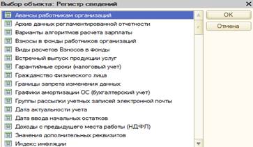 Регистры – это таблицы для накопления определенных данных и получения сводной информации. Данные в регистры добавляются только при проведении документов. Сведения из регистров используются для формирования отчетов. Существуют регистр: ü Регистры сведений; ü Регистры накопления; ü ü Регистр расчетов. Регистры сведений – могут хранить в базе данных произвольную информацию в разрезе нескольких измерений. Список любого регистра сведений можно открыть в меню «Операции – Регистры сведений». Информация в регистре сведений хранится в виде записей, каждая из которых содержит значения измерений и соответствующие им значения ресурсов. В качестве информации могут выступать значения любого типа.