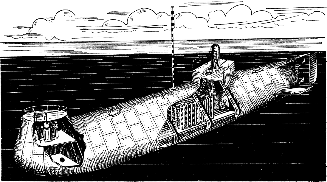 водою так же быстро, как пароход, может подниматься вверх и опускаться на какую угодно глубину, легко двигаться под водою по всем направлениям и, наконец, пробыть под водою сколько угодно без всякой опасности... Лодка вся из железа, форма ее рыбообразная, т. е. она закруглена снизу, а кверху заострена... Движение лодки производится машиною... похожею на обыкновенную винтовую паровую машину; разница только в том, что вместо пара употребляется сжатый воздух, который после действия своего на машине служит средством вентилирования воздуха самой лодки. ...Нельзя не указать и другого применения описанной мной подводной лодки: она может служить прекрасным аппаратом для отыскания погибших судов...»1. Характерно, что первоначально предложение Александровского было вообще отвергнуто Морским ученым комитетом по мотивам, зафиксированным в такой форме: «Предложение его остроумное, как занятие кабинетное, не может иметь практического применения»2. Лишь вмешательство авторитетного кораблестроителя морского инженера Бурачека, настойчивые ходатайства изобретателя и поддержка компетентных военно-морских специалистов привели наконец к тому, что правительство ассигновало ему на постройку лодки 140 тысяч рублей с условием выплаты их по частям после того, как изобретатель представит для испытания готовую, выстроенную за его собственный счет лодку. Волей-неволей Александровскому пришлось принять это кабальное условие. В июне 1865 года лодка была спущена со стапелей Адглиралтейского завода для достройки на воде и в октябре того же года отведена в Кронштадт. Всю зиму изобретатель с энтузиазмом руководил работами по монтажу двигателей и механизмов на своем подводном корабле. Это было оригинальное плавучее сооружение длиной около 33 и шириной до четырех метров, полное {46} подводное водоизмещение которого составляло 365 тонн. Александровский установил на своей лодке кормовые горизонтальные рули, но малая скорость ее движения под водой не обеспечивала достаточную силу реакции встречной струи воды на плоскости рулей. Вследствие этого горизонтальные рули не могли преодолеть инерцию тяжелого корпуса лодки, и она плохо удерживала заданное углубление, что неоднократно отмечалось на испытаниях. Над небольшой площадкой-палубой, огражденной леером1, возвышалась круглая башенка-рубка, здесь же был расположен и люк для входа с высоким порогом — комингсом2. В поперечном сечении корпус подводной лодки представлял собой обращенный вершиной кверху треугольник с выпуклыми закругленными сторонами, широким, почти плоским днищем и острым хребтом. При такой форме корпуса встречное сопротивление воды должно было несколько тормозить скорость погружения подводной лодки, предохраняя ее от опасности опуститься ниже установленной глубины и быть раздавленной слоем воды. В кормовой части лодки располагались один над другим два гребных винта. Они приводились во вращение двумя трехцилиндровыми 70-сильными пневматическими двигателями, работавшими сжатым воздухом. Запас сжатого воздуха хранился в специальных стальных баллонах, батарея которых вмещала около 50 кубических метров воздуха под давлением до 100 атмосфер. Внутри корпуса лодки, посредине, в нижней его части, была установлена балластная цистерна, предназначенная для приема водяного балласта при погружени