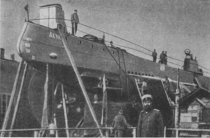 Подводное водоизмещение «Дельфина» составляло 124 тонны, а мощность бензинового двигателя внутреннего сгорания для надводного хода достигала 300 лошадиных сил. Под водой «Дельфин» приводился в движение 120-сильным электромотором, получавшим энергию от аккумуляторной батареи, запаса которой хватало на 28 миль хода со скоростью шесть узлов. Лодка была вооружена двумя торпедными аппаратами системы Джевецкого, что делало ее опасным противником для надводных кораблей. Вполне удовлетворительные результаты испытаний «Дельфина» доказали способность русских инженеров и техников справиться с проектированием и строительством подводных лодок. Сравнение тактико-технических элементов этой первой русской подводной лодки XX века с широко разрекламированными лодками американских фирм Симона Лэка и Джона Голланда показывает определенные преимущества некоторых важных элементов {74} «Дельфина». Так, например, его надводная скорость хода была на полтора узла выше скорости лодок Голланда, располагавших лишь одним торпедным аппаратом, тогда как «Дельфин» имел их два. Глубина погружения этой лодки доходила до 50 метров, что на 20 метров превышало глубину погружения лодок Лэка. Вскоре Бубнову было поручено проектирование второго подводного корабля несколько больших размеров, с более мощным торпедным вооружением. Эскизный проект его был закончен в трехмесячный срок и в декабре 1903 года одобрен Морским техническим комитетом. Подводное водоизмещение новой подводной лодки возрастало до 172 тонн, а вооружение усиливалось за счет доведения числа торпедных аппаратов до четырех. Головная лодка, строившаяся на Балтийском заводе поэтому проекту, получила название «Касатка». Напряженная обстановка, сложившаяся на Дальнем Востоке, и ухудшение взаимоотношений с Японией заставило русское правительство принять срочные меры к срочному пополнению флота подводными лодками, строительство которых занимало меньше времени и обходилось значительно дешевле, чем строительство крупных надводных кораблей. Хотя отечественные проекты подводных лодок выгодно отличались от иностранных рядом новых оригинальных особенностей, слабость русской промышленности вынуждала заказывать корабли за границей. Однако события нарастали быстрее, чем предполагало царское правительство. 26 января 1904 года Япония без объявления войны начала военные действия против России прежде всего на море, где Япония обладала значительным превосходством в силах. К началу русско-японской войны в составе русского флота была лишь одна подводная лодка «Дельфин», да и та находилась вдали от театра военных действий — на Балтийском море. Обстоятельства требовали принятия энергичных мер. В связи с этим в конце февраля 1904 года Балтийскому заводу был выдан заказ на постройку еще четырех подводных лодок типа «Касатка», а в марте на средства, собранные населением, тому же заводу была заказана дополнительно одна такая же лодка. Кроме {75} того, Невскому заводу было поручено строительство шести подводных лодок по проекту фирмы Голланда, с которой русским правительством было заключено соответствующее соглашение. По этому соглашению американская фирма обязалась доставлять готовые детали Невскому заводу, где из них должны были собираться указанные лодки. Балтийский завод весьма успешно справился с 