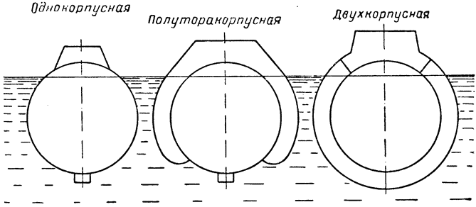 охватывающий прочный корпус, заметно повышает мореходные качества подводных лодок и увеличивает их запас плавучести. Обычно средние и малые подводные лодки строятся полуторакорпусными. Это значит, что легкий корпус не полностью окружает прочный корпус, а только частично сверху и по бортам, как это показано на рисунке. У двухкорпусных и полуторакорпусных подводных лодок носовая и кормовая оконечности приобретают при помощи легкого корпуса плавные обтекаемые обводы, присущие обводам быстроходных надводных кораблей. Такая архитектура длительный период соответствовала техническим возможностям подводных лодок, которые в силу несовершенства дизель-электрической энергетики были вынуждены находиться преимущественно в надводном положении. Применение атомных силовых установок коренным образом меняет дело и дает возможность подводному кораблю совершать длительные переходы под водой не всплывая на поверхность. При этих условиях отпадает {121} необходимость придавать корпусу подводной лодки форму и обводы надводного корабля. Наоборот, нужно стремиться подобрать такую конфигурацию корпуса, которая создавала бы наименьшее сопротивление при движении и оптимально соответствовала условиям плавания под водой. При решении этой задачи возникла идея использовать формы тела рыб и морских животных, подсказанные самой природой. Это не было новым открытием. Достаточно вспомнить, что по такому же пути шли строители первых типов подводных лодок. Рыбоподобную форму корпуса имели, например, подводная лодка Александровского, «Дельфин» Бубнова и другие лодки, созданные русскими судостроителями. В течение ряда последних лет конструкторы подводных лодок многих стран работают над проблемой увеличения подводной скорости хода лодок. В частности, в США в 1949 году было испытано несколько десятков моделей скоростных подводных лодок; лучшие результаты показала лодка с корпусом каплеобразной формы. В марте 1952 года была заложена, а в начале 1954 года вошла в строй опытная подводная лодка «Альбакор», корпус которой напоминает тело кита или дельфина. Эта лодка имеет длину 61 метр и надводное водоизмещение около 1200 тонн. С дизель-электрической установкой, равной по мощности такой же установке на подводной лодке обычной формы и одинакового водоизмещения, скорость «Альбакора» была несколько выше. Так практика подтвердила результаты испытаний моделей и на опыте «Альбакора» доказала, что внешние обводы и отделка поверхности обшивки играют большую роль в борьбе за увеличение скорости движения подводных кораблей. Прочный корпус рассчитывается методами, установленными специальной наукой о сопротивлении материалов, с определенным запасом прочности, обеспечивающим надежную способность его противостоять гидростатическому давлению воды, которое будет сжимать корпус подводной лодки при погружении лодки на максимальную, заданную техническими условиями, глубину. Насколько важно предусмотреть достаточную прочность корпуса, можно понять, представив себе, какому {122} огромному давлению воды подвергается подводная лодка даже на сравнительно небольшой глубине. Попробуем подсчитать, какие силы действуют на прочный корпус подводного корабля на глубине 50 метров. Расчет произведем для небольшой лодки водоизмещением не более 300 тонн. Длина такой лодки 