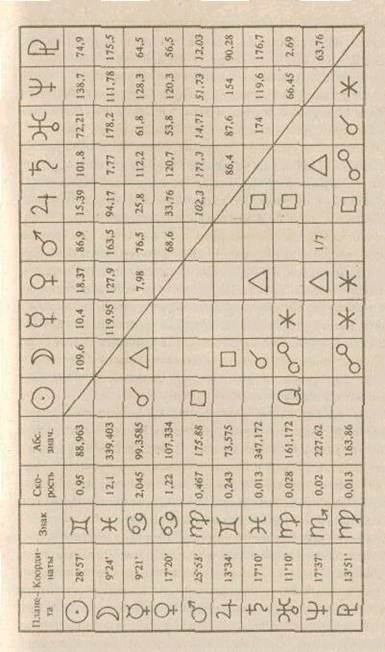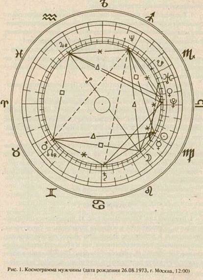 структур: 1) Сатурн, Нептун, Венера; 2) Нептун, Плутон, Венера; 3) Луна, Плутон, Юпитер; 4) Луна, Уран, Юпитер; 5) Сатурн, Плутон, Юпитер; 6) Сатурн, Плутон, Венера; 7) Луна, Венера, Плутон. Среди конфигураций аспектов можно выделить "парус", который образуют большой тригон между Венерой, Сатурном и Нептуном и бисекстиль, образованный трином Венеры и Нептуна и секстилями Венеры и Плутона, Нептуна и Плутона. Продольная ось "паруса" — оппозиция между Сатурном и Плутоном. "Парус" — конфигурация исключительно стабильная, устойчивая, не умеет менять своих структур и очень рано формирует характер человека. Дает кажущуюся пластичность поведения, но психологическая ситуация на редкость стабильна и почти не изменяется с течением времени. В данной карте три тау-квадрата или, иначе говоря, тройной тау-квадрат, вершину которого составляет Юпитер, усиленный восходящим лунным узлом, а в основании лежат соединение Сатурна и Луны, с одной стороны. Урана и Плутона — с другой. Концентрация больших энергий на Юпитере: возможны, в частности, проблемы с получением высшего образования. Разрядка может осуществляться через аспекты Сатурна, входящего в состав большого тритона (самодисциплина, упорный труд), и соединение Урана с Плутоном в составе двух синтетических треугольников (широкие общественные связи, помощь единомышленников). Еще одна конфигурация — синтетический треугольник, образуемый трином Меркурия и Луны, секстилем между Меркурием и соединением Урана и Плутона, а также оппозицией между Луной и. тем же соединением Урана и Плутона, Такая конфигурация с Меркурием на вершине (кстати, Меркурий имеет отдаленное — 10,5° — соединение с Солнцем), может давать обладателю космограммы тенденцию собирать вокруг себя единомышленников. 4. Синтез по крестам и стихиям — Рыбы, так как преобладают планеты в мутабельных знаках и в знаках Воды. Пять планет из десяти находятся в водных знаках. Столь явное преобладание водной стихии дает пластичность, восприимчивость. В земных знаках три планеты, что дает достаточно практичности, терпения, усердия. Воздуха довольно мало— две планеты. Это сокращает число контактов, но обилие планет в водных знаках повышает способности эмпатии, внимание к людям, умение приспособиться к ситуации, к партнерству- В знаках Огня совсем нет планет, отсюда нерешительность, недостаток инициативы. Восприимчивость заметно преобладает над активностью. Планеты распределяются по квандрантам и полусферам следующим образом: в 1-м квадранте две: Юпитер и Солнце; во 2-м—. пять планет: Меркурий, Венера, Уран, Плутон и Марс; в 3-м — Нептун, в 4-м — Луна и Сатурн. Семь планет из десяти сосредоточены в нижней полусфере, три — в верхней; в восточной полусфере четыре планеты, в западной — шесть. Это значит, что человек предпочитает действовать в коллективе и малоинициативен (на что уже были указания), но есть все же предпосылки и для самостоятельных действий (в случае необходимости). Это значит еще и то, что у человека больше идей, чем возможностей их реализовать- 5. Расположение планет. Меркурий вечерний — неторопливый, старое предпочитает новому, не торопится делать выводы. Венера также вечерняя — очень осторожна в своих оценках, любит выждать, пока ситуация прояснится, старается избегать ошибок. Зато Солнцу предшествуют Луна, Сатурн и Юпитер, — человек в своих пост