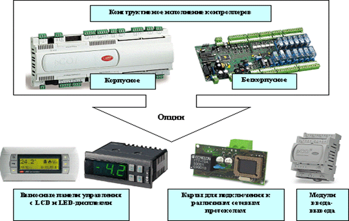 Существует два типа исполнения данного контроллера – это корпусное и бескорпусное, что обеспечивает удобство при эксплуатации. Так же данный контроллер может исполняться с LCD и LED дисплеями, имеет различные модули ввода-вывода, карты для подключения к различным сетевым протоколам.