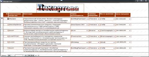 Access предоставляет возможность вводить данные как непосредственно в таблицу, так и с помощью форм. Форма в БД − это структурированное окно, которое можно представить так, чтобы оно повторяло форму бланка. Формы создаются из набора отдельных элементов управления. Внешний вид формы выбирается в зависимости от того, с какой целью она создается. Формы Access позволяют выполнять задания, которые нельзя выполнить в режиме таблицы. Формы позволяют вычислять значения и выводить на экран результат. Источником данных для формы являются записи таблицы или запроса. Форма предоставляет возможности для: · ввода и просмотра информации базы данных, · изменения данных, · печати данных, · создания диаграмм, сообщений и пр. Способы создания форм в Access могут быть разными: · Конструктор форм (предназначен для создания формы любой сложности). · Мастер форм (позволяет создавать формы различные как по стилю, так и по содержанию). · Автоформа: в столбец (многостраничная – поля для записи выводятся в один столбец, в форме одновременно отображаются данные для одной записи). · Автоформа: ленточная (все поля записи выводятся в одну строку, в форме отображаются все записи) · Автоформа: табличная (отображение записей осуществляется в режиме таблица). · Автоформа: сводная таблица. · Автоформа: сводная диаграмма. · Диаграмма (создается форма с диаграммой, построенной Microsoft Graph). · Сводная таблица (создается форма Access, отображаемая в режиме Excel). С помощью инструментария Access для таблицы был созданы ленточные автоформы, которые позволяют с легкостью добавлять новые записи. На рис. 1.11.представлена одна из ленточных автоформ − «Лекарства». Всего было создано 7 подобных автоформ, для каждой из таблицы БД «Аптека». Для создания автоформы «Лекарства» использован графический инструментарий «WotArt», что позволило создать красочную надпись «Лекарства» (рис. 1.11).