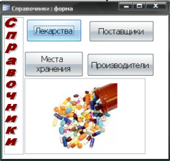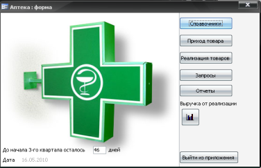 Рис. 1.13 – Форма «Аптека» С помощью графических инструментов Microsoft Access на форму добавлен логотип аптеки. На форме «Аптека» также отражается информация о текущей дате и остатке дней до начала третьего квартала 2010 года. Данная динамическая информация реализована при помощи встроенных функций СУБД Microsoft Access – Date() и DateDiff(). Функция Date() возвращает полю значение текущей даты, а встроенная функция DateDiff() временной интервал между заданными промежутками времени. По нажатию кнопки справочники появляется форма «Справочники» (рис.1.14). Для оформления данной формы также были использованы графические возможности Microsoft Access: добавлен рисунок и надпись в стиле «WordArt». Форма справочники обеспечивает навигацию с таблицами «Лекарства», «Поставщики», «Места хранения», «Производители». По нажатию на одноименные кнопки появятся формы к указанным таблицам, позволяющие осуществлять ввод данных.