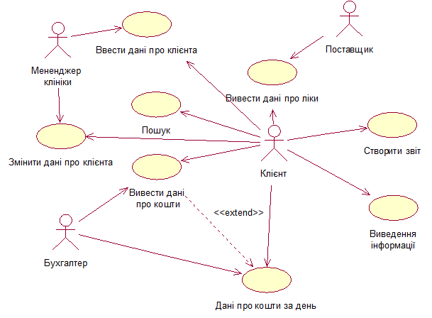 UML (англ. Unified Modeling Language - уніфікована мова моделювання) - мова графічного опису для об'єктного моделювання в області розробки програмного забезпечення. UML є мовою широкого профілю, це - відкритий стандарт, який використовує графічні позначення для створення абстрактної моделі системи, званої UML-моделлю. UML був створений для визначення, візуалізації, проектування та документування, в основному, програмних систем. UML не є мовою програмування, але на підставі UML-моделей можлива генерація коду. Діаграма варіантів використання (use case diagram) - діаграма, на якій зображуються відносини між акторами й варіантами використання. Актор являє собою будь - яку зовнішню стосовно моделюємої системи сутність, що взаємодіє із системою й використувує її функціональні можливості для досягнення певних цілей або рішення окремих завдан. При цьому актори служать для позначення погодженої безлічі ролей, які можуть грати користувачі в процесі взаємодії із проектованою системою. Кожень актор може розглядатись як окрема роль щодо конкретного варіанта використання. Стандартне позначення актора на діаграмах є "чоловічок".