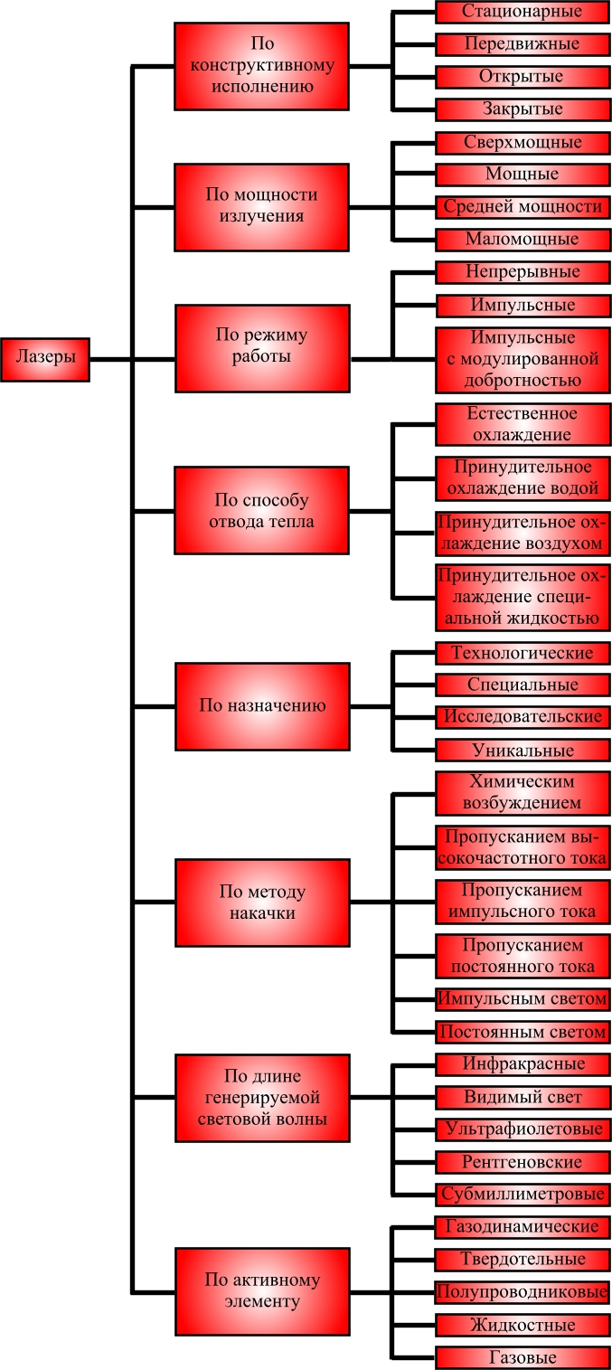 «Лазер» - аббревиатура, образованная из начальных букв английской фразы Light amplification by stimulated emission of radiation- усиление света за счет создания стимулированного излучения. Лазер (оптический квантовый генератор) - генератор электромагнитного излучения оптического диапазона, основанный на использовании вынужденного (стимулированного) излучения. Лазерное излучение – это электромагнитное излучение, которое формируется в (лазерах) с длиной волны 0,2-1000мкм: 0,2…0,4 мкм - ультрафиолетовая, 0,4…0,75 мкм - видимого света, ближнего инфракрасного 0,75…1,4 мкм, инфракрасного 1,4…102 мкм. Отличительная особенность лазерных излучений является: монохромность излучения ( строго одной длины волны); когерентность излучения (все источники излучения испускают электромагнитные волны в одной фазе); острая направленность луча (малое расхождение). Лазерное излучение различают по виду излучения на - прямое (заключенное в ограниченном телесном угле) - рассеянное (рассеянное от вещества, находящегося в составе среды, сквозь которую проходит лазерный луч) - зеркально-отраженное ( отраженное от поверхности под углом, равным углу падения излучения) - диффузно-отраженное (отражается от поверхности по всевозможным направлениям) Как техническое устройство лазер состоит из трех основных элементов: - активной среды - резонатора - системы накачки. В зависимости от характера активной среды лазеры подразделяются на следующие типы: твердотельные (на кристаллах или стеклах); газовые (He-Ne, Ar, Kr, Xe, Ne, He-Cd, CO2 и др.); жидкостные; полупроводниковые и др. В качестве резонатора обычно используются параллельные зеркала с высоким коэффициентом отражения, между которыми размещается активная среда. Накачка, т.е. перевод атомов активной среды на верхний уровень, обеспечивается или посредством мощного источника света или электрическим разрядом. Существуют лазеры непрерывного и импульсного действия. Классификацию лазеров можно представить в следующем виде (рис):