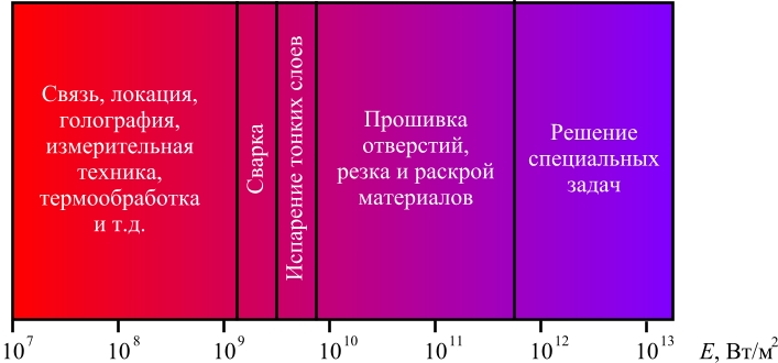 Лазеры получили широкое применение в научных целях, в практической медицине, а также в различных областях техники. Области применения лазера определяются энергией используемого лазерного излучения:
