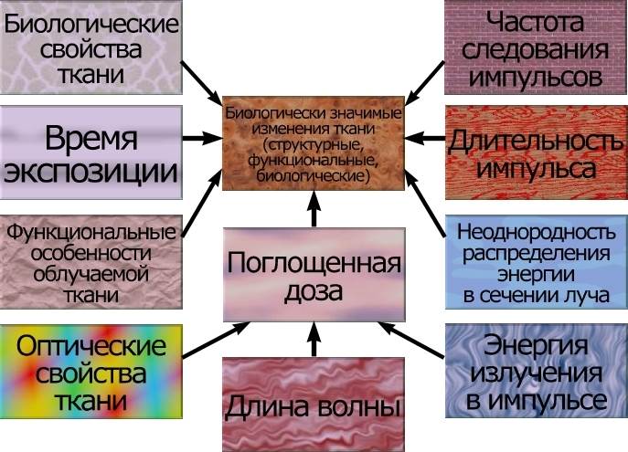 Биологическое действие лазерного излучения зависит от энергии излучения Е, энергии импульса Е и, плотности мощности (энергии) W p (W e), времени облучения t, длины волны l, длительности импульса t, частоты повторения импульсов f, потока излучения Ф, поверхностной плотности излучения Е э, интенсивности излучения I.