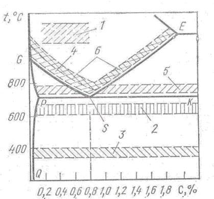 Рис. 1. Температуры нагрева при отжиге и нормализации: отжиг I рода (1 – диффузионный отжиг; 2 – рекристаллизационный отжиг; 3 – отжиг для снятия напряжений); отжиг II рода (4 – полный отжиг; 5 – неполный отжиг); 6 – нормализация.