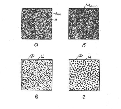 Рис. 4 Схемы зарисовки микроструктур термообработанных сталей, ~ х 1500: а) после нормальной закалки (V > Vкр); б) после закалки и низкотемпературного отпуска (мартенсит отпуска); в) после закалки и среднетемпературного отпуска (троостит отпуска); г) после закалки и высокотемпературного отпуска (сорбит отпуска)
