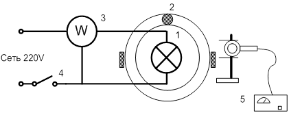 Экспериментальная установка (рис. 2.1) включает в себя: 1 – светильник с лампой (накаливания или люминесцентной, работающей с частотой от 12500-35000 Гц); 2 – поворотный стол; 3 – ваттметр для измерения потребляемой лампами из сети электрической мощности; 4 – выключатели; 5 – прибор для измерения освещенности люксметр.
