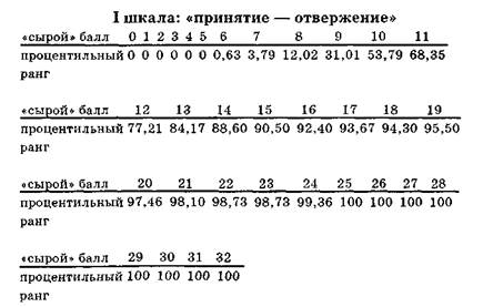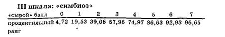 При подсчете тестовых баллов по всем шкалам учитывается ответ «верно». Высокий тестовый балл по соответствующим шкалам интерпретируется как: I – отвержение, II – социальная желательность, III – симбиоз, IV – гиперсоциализация, V – инфантилизация (инвалидизация). Тестовые нормы приводятся в виде таблиц процентильных рангов тестовых баллов по соответствующим шкалам = 160