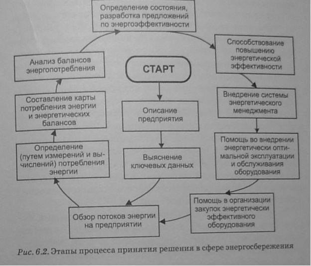 В основе практической реализации этих функций лежит информационный банк данных о динамике энергетических и материальных потоков на предприятии. Сбор, классификация, и обработка этих данных проводятся, как правило, посредством внутреннего и внешнего менеджмента в рамках предварительного энергетического аудита. Критический анализ собранной информации на основ структурных моделей производства позволяет сделать обоснованные выводы относительно энерготехнологической эффективности работы предприятия, а также разработать комплекс организационно-технических мероприятий (ОТМ) по ее повышению. Кроме того, сравнительный анализ удельных энергетических затрат на выпуск продукции установленного качества с показателями предприятий аналогичного профиля и отраслевой нормой расхода ТЭР на одноименную продукцию позволяет принять решение о необходимости модернизации исследуемого технологического процесса. Данные действия энергоменеджера непосредственно связаны с реализацией функций планирования и организации. Реализация функции менеджмента организация должна обеспечить условия успешного внедрения запланированных ОТМ, включая материалы, оборудование, денежные средства, обучение персонала и т. п. На этой стадии энергетический менеджер участвует в управлении предприятием при составлении бюджета по энергосбережению на следующий год, выработке производственных планов и стратегии предприятия. Кроме того, в его обязанности входит подготовка бизнес-планов для привлечения инвестиций из внешних источников с целью реализации высокозатратных энергосберегающих мероприятий Наиболее действенным и простым методом достижения большей энергоэффективности технологических процессов и оборудования на предприятии является внедрение в сознание персонала «психологии энергосбережения», т. е. осознанного и мотивированного применения на практике правил эффективного использования энергии.