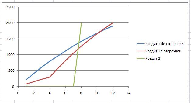 Кредит номер 1 – без отсрочки погашения является наиболее приемлемым вариантом, поскольку итоговые выплаты с учетом дисконтирования за весь срок у данного вида кредита являются наименьшими (1 902 300 рублей).
