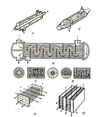 а – «труба в трубе» противоток; б – кожухотрубный противоток; в, г, д – кожухотрубный многократный перекрестный ток; е- трубчатый перекрестный ток; ж – пластинчато-ребристый перекрестный ток; 1- горячий поток; 2 – холодный поток