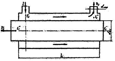 При прямоточной схеме движения горячий и холодный теплоносители движутся вдоль поверхности нагрева в одном направлении так, что на входе в аппарат тепло передается от горячего теплоносителя к холодному при относительно большой разности температур. На выходе из аппарата тепло передается от остывшего горячего теплоносителя к холодному при меньшей разности температур. Противоточная схема (противоток). При этой схеме движения теплоносители 1 и 2 движутся вдоль поверхности нагрева в противоположных так, что входящий в аппарат горячий теплоноситель отдает тепло уже подогретому теплоносителю. Коэффициент теплоотдачи k в теплообменных аппаратах определяют обычно по формулам для плоской стенки, т.к. трубки теплообменников имеют небольшую толщину по сравнению с их диаметром. Полученные формулы позволяют сравнить среднетемпературные напоры при различных схемах движения теплоносителей. Анализ их показывает, что при одинаковых температурах теплоносителей на входе и выходе их теплообменного аппарата, в противоточном теплообменнике температурный напор получается наибольшим. Благодаря большой величине температурного напора рабочая поверхность при противоточной схеме больше. Для определения коэффициента теплопередачи требуется знать количество тепла, переданного за единицу времени в теплообменном аппарате, среднюю разность температур Δt между горячим и холодным теплоносителями и размер поверхности F. Количество тепла определяется по расходу теплоносителей, их теплоемкости и изменению их температуры в теплообменном аппарате. В идеальном аппарате, работающем без теплообмена с окружающей средой, количество тепла, отданное горячим теплоносителем Q1, должно равняться количеству тепла Q2, полученному холодным теплоносителем.