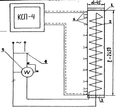 Для измерения температуры поверхности трубы в её стенку зачеканены спаи двенадцати хромель-алюмелевых термопар 6 с диаметром электродов 0,5·10-3 м. Поскольку наиболее равномерное распределение температуры имеет место в средней части трубы, то здесь термопары размещены реже, чем на концах. Показания термопар записываются на ленте двенадцати канального точечного самопишущего потенциометра КСП-4 класса точности 0,25. Температура воздуха измеряется вдали от опытной трубы с помощью ртутного термометра. Все измерения проводятся при установившемся тепловом состоянии трубы. Это состояние характеризуется неизменностью во времени значений температур поверхности трубы, которые регистрируются на ленте самопишущего потенциометра КСП-4. После того как такое тепловое состояние установится, с ленты самописца снимают значения температур и фиксируют мощность электронагревателя, соответствующую данному режиму. Для перехода на новый температурный режим системы необходимо изменить с помощью автотрансформатора мощность электрического нагревателя. При выполнении работы опыты проводятся на трех режимах со средней температурой стенки трубы в пределах от 300К до 500К.