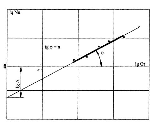 Зависимость (3) между критериями Nu и Gr приближенно может быть принята степенной: Nu = A·Grn, где постоянная А и показатель степени n определяются по экспериментальным данным. Для этого в логарифмической системе координат lg Nu – lg Gr наносят значения, полученные из опыта. Так как в этой системе координат уравнение lg Nu = lg A + lg Gr является прямой линией, то по экспериментальным точкам проводится прямая, по которой определяют величины постоянной А и показателя степени n (рис. 4.1).