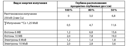Примечание. Расстояние источник-поверхность для рентгенотерапевтического аппарата - 50 см; гамма-терапевтического - 80 см; линейных ускорителей - 100 см. Из данных табл. 2.2 видно, что мегавольтное излучение в отличие от ортовольтного рентгеновского имеет максимум дозы не на поверхности кожи, глубина его возрастает с повышением энергии излучения (рис. 13). После достижения электронами максимума отмечается крутой градиент дозы, что позволяет снизить дозовую нагрузку на подлежащие здоровые ткани. Протоны отличаются отсутствием рассеяния излучения в теле, возможностью торможения пучка на заданной глубине. При этом с глубиной проникновения линейная плотность энергии (ЛПЭ) возрастает, величина поглощенной дозы увеличивается, достигая максимума в конце пробега частиц,