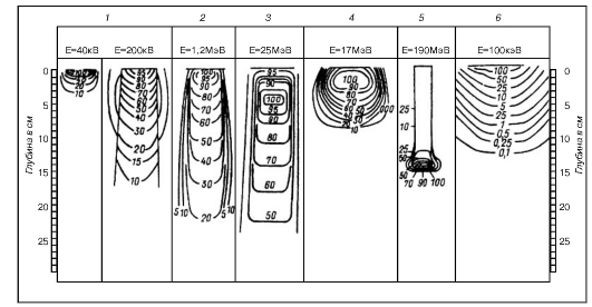Рис. 13. Распределение энергии разных видов излучения в тканеэквивалентном фантоме: 1 - при близкофокусной рентгенотерапии 40 кВ и глубокой рентгенотерапии 200 кВ; 2 - при гамма-терапии 1,25 МэВ; 3 - при тормозном излучении 25 МэВ; 4 - при облучении быстрыми электронами 17 МэВ; 5 - при облучении протонами 190 МэВ; 6 - при облучении медленными нейтронами 100 кэВ