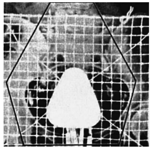 Рис. 44. Рак шейки матки. Дистанционное облучение с использованием формирующего блока(схема фронтального сечения тела) Применение в качестве радиомодификатора метронидазола, растворенного в диметилсульфоксиде (ДМСО), позволило повысить пятилетнюю выживаемость больных II стадии на 13 %, III стадии - на 23 %. ДМСО проявляет свои протекторные свойства, как при самостоятельном применении, так и в качес- тве растворителя метронидазола. Частота лучевых повреждений прямой кишки и мочевого пузыря при использовании ДМСО снижается в 4-6 раз. При этом удается полностью избежать тяжелых (язвенных или фистульных) лучевых повреждений. При I стадии рака шейки матки 5-летняя выживаемость колеблется от 73 до 97,5 %. При II стадии, согласно статистическим данным, охватывающим результаты лечения в крупных клиниках мира, 5-летняя выживаемость больных в среднем составляет 48-50 %. При III стадии злокачественного процесса 5-летняя выживаемость варьирует от 12,5-35 до 63-69,1 %, и при IV стадии - от 0 до 29,2 %.