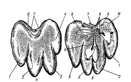 Рис. 20. Осмотр печени свиньи а — диафрагмальная поверхность, б — висцеральная поверхность, момент разреза паренхимы и желчных ходов в области ворот: 1— правая латеральная доля, 2 правая медиальная доля, 3 — левая медиальная доля, 4 — левая латеральная доля, 5 — желчный пузырь, 6 — разрез желчных ходов и паренхимы, 7 — диафрагма,8— воротная вена, печеночная артерия и желчный проток, 9 — каудальная полая вена, 10 — хвостовая доля печени (рудимент).