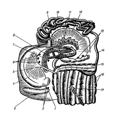 Рис. 21. Желудочно-кишечный тракт с селезенкой и лимфатическими узлами, подготовленный для осмотра 1 — селезенка, 2 — лимфатические узлы селезенки, 3 — большой сальник, 4 — желудок, 5 — пищевод, 6 — лимфатические узлы желудка, 7 — поджелудочная железа, 8 — ее лимфатические узлы, 9— двенадцатиперстная кишка, 10 — тонкий отдел кишечника, 11— брыжеечные лимфатические узлы, 12 — брыжейка тонкого отдела кишечника и радиально расположенные сосуды ее, 13 — прямая кишка и ее лимфатические узлы, 14 — подвздошная кишка, 15 — слепая кишка, 16 — ободочная кишка (кудрявка), 17 — лимфатические узлы ободочной кишки.