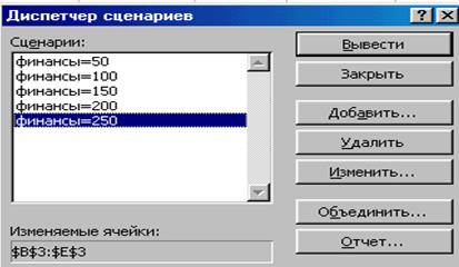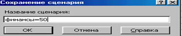 Рисунок 1 – Окно СОХРАНЕНИЕ СЦЕНАРИЯ - Ввести имя сценария финансы=50 - ОК На экране появится диалоговое окно Результат решения задачи для данного варианта финансы=50