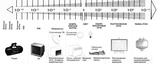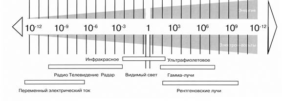 Лучевая диагностика занимается применением различных видов проникающих излучений, как ионизационных, так и не ионизационных, с целью выявления заболеваний внутренних органов. Лучевая диагностика в настоящее время достигает 100% применения в клинических методах обследования больных и состоит из следующих разделов: рентгенодиагностика (РДИ), радионуклидная диагностика (РНД), ультразвуковая диагностика (УЗД), компьютерная томография (КТ), магнитно-резонансная томография (МРТ). Порядок перечисления методов определяет хронологическую последовательность внедрения каждого из них в медицинскую практику. Удельный вес методов лучевой диагностики по данным ВОЗ на сегодня составляет: 50% УЗД, 43% РД (рентгенография легких, костей, молочной железы – 40%, рентгенологическое исследование желудочно-кишечного тракта – 3%), КТ – 3%, МРТ –2%, РНД-1-2%, ДСА (дигитальная субтракционная артериография) – 0,3%. 1.1. Принцип рентгенодиагностики заключается в визуализации внутренних органов с помощью направленного на объект исследования рентгеновского излучения, обладающего высокой проникающей способностью, с последующей регистрацией его после выхода из объекта каким-либо приемником рентгеновских лучей, с помощью которого непосредственно или опосредственно получается теневое изображение исследуемого органа. 1.2. Рентгеновские лучи являются разновидностью электромагнитных волн (к ним относятся радиоволны, инфракрасные лучи, видимый свет, ультрафиолетовые лучи, гамма-лучи и др.). В спектре электромагнитных волн они располагаются между ульрафиолетовыми и гамма-лучами, имея длину волны от 20 до 0,03 ангстрем (2-0,003 нм, рис. 1). Для рентгенодиагностики применяются самые коротковолновые рентгеновские лучи (так называемое жёсткое излучение) с длиной от 0,03 до 1,5 ангстрем (0,003-0,15 нм). Обладая всеми свойствами электромагнитных колебаний – распространение со скоростью света