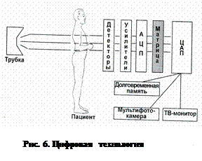 свечивание с помощью УРИ называют рентгенотелевизионной скопией, и, помимо исследования ЖКТ, оно применяется при проведении интервенционных методов радиологии, так как часть интервенционных манипуляций проводятся под контролём рентгенотелевизионного просвечивания. При дигитальной (цифровой) техн ологии (рис. 6) рентгеновские лучи, пройдя через тело пациента, улавливаются детекторами, где они превращаются в электрические сигна
