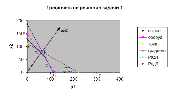 Точки множества допустимых решений должны удовлетворять всем ограничениям. Следовательно, множество допустимых решений является пересечением всех допустимых полуплоскостей и представляет собой многоугольник АВСDО. Любая точка, расположенная внутри этого многоугольника или на любом отрезке его границы, является допустимым решением, т.е. удовлетворяет всем ограничениям модели. Для нахождения оптимального решения задачи необходимо определить направление возрастания целевой функции. Вектор, компоненты которого являются коэффициентами целевой функции при переменных х1 и х2, называют вектором – градиентом целевой функции и обозначают grad Z. Целевая функция может возрастать до тех пор, пока линии уровня соответствующие возрастающим значениям этой функции, пересекают область допустимых решений. Точка пересечения области допустимых решений и линии уровня, соответствующей максимально возможному значению целевой функции, и будет точкой максимума. На рисунке видно, что оптимальное решение соответствует точке В, лежащей на пересечении прямых (2) и (3). Поэтому ее координаты находим как решение системы линейных уравнений, задающих эти прямые: