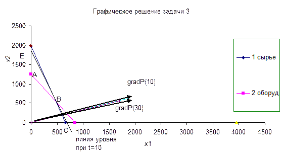 Если «закрепить» линию уровня в т.В и начать увеличивать значение параметра t, то точка Е пересечения линии уровня с осью Ох2 начнет перемещаться вверх по оси Ох2 по направлению к точке D. Найдем значение t, при котором линия уровня параллельна ВС. Из равенства угловых коэффициентов получаем: (1095 – 8,8t)х1 + (520 – 3,3 t)х2