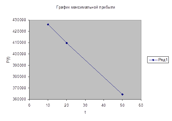 Если tÎ[20; 50] точкой максимума станет точка C(520;0). Найдем максимальный размер прибыли для tÎ[20;50]: Р* =(1095-8,8t)´520 +0 = 1292280 – 5808t (руб.), Размер необходимого кредита: V* = 8tx1* + 3tx2* = 8´t´520 + 0 =5280t руб., Сумма уплаченных процентов: 0,1V* = 528tруб. Потребность в трудовых ресурсах: S* = 8x1* +3 x2* = 8´520 + 0 = 5280(чел.-час.). Итоги решения задачи представим в таблице: