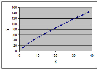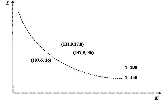 3) Известны объем выпуска продукции Yбаз = 200 (ед.) и наличные трудовые ресурсы Lбаз =36 (тыс. чел.-час.) в базовом периоде. Определим потребность в оборудовании в плановом периоде при увеличении объема выпуска продукции на 10%, если возможность увеличения трудовых ресурсов составляет не более 5%. При заданном увеличении объем выпуска продукции составит Y = 1.1× Yбаз = 1.1×200 = 220 (ед.). Существует множество комбинаций факторов производства (K, L), обеспечивающих выпуск продукции в объеме 220 ед. Потребность в оборудовании в плановом периоде можно выразить как функцию от объема трудовых ресурсов. Используя уравнение изокванты