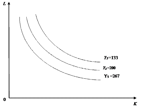 2) Изокванта — совокупность всех комбинаций факторов производства (K, L), обеспечивающих одинаковый объем выпускаемой продукции. Изокванты дают графическое представление двухфакторной производственной функции Y (K, L)в виде ее линий уровня. По условию Y 1=133; Y2 = 200; Y 3=267. Выпишем соответствующие этим значениям уравнения изоквант: Y= 4 Y= 4 Y= 4 Для построения на декартовой плоскости OKL изоквант из их уравнений в явном виде выразим переменную L как функцию от переменной K: