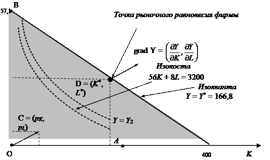 Графическое решение задачи производителя Ее решение можно найти графическим методом. Для этого построим область допустимых решений, задаваемую условиями (1) и (2). Она представляет собой заштрихованный треугольник ОАВ. Граничная прямая АВ бюджетного ограничения задается уравнением 560K + 80 L = 32000 Для определения оптимального решения проведем несколько линий уровня (изоквант) целевой функции, имеющих общие точки с областью допустимых решений. Как было показано в п. 2, чем выше находится изокванта, тем большему уровню целевой функции она соответствует (Y2 > Y1). Поэтому изокванта, соответствующая максимально возможному объему выпуска, должна касаться граничной прямой бюджетного ограничения (1), а точка ее касания D будет оптимальным решением задачи. Для нахождения значений координат точки D используем тот факт, что градиент целевой функции grad Y =