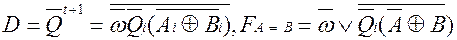 или, преобразуя выражение получим схему компаратора, приведенную на рис. 31. Рис. 31 Пример 2. Построить схему последовательного сравнения на равенство. Примем, что в исходном состоянии выходной сигнал триггера запоминания предыдущих результатов Q= 0, а положение последних сравниваемых разрядов задается значением сигнала w=1. Зададим алгоритм работы синхронного автомата следующим образом: 1) автомат находится в состоянии Q= О до тех пор, пока значения разрядов А и в совпадают; 2) первое несовпадение значений разрядов А и В кодов переводит автомат в состояние Q=1 и в этом состоянии автомат остается до окончания подачи разрядов кодов; 3) решение о равнозначности FA=B= 1 или неравнозначности FA=B= 1 сравниваемых кодов принимается при подаче последних разрядов кодов; 4) после подачи последних разрядов чисел автомат должен возвращаться в исходное состояние. Функции переходов и функции возбуждения данной схемы приведены в табл. 6. Таблица 6