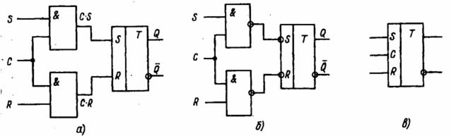 Синхронные триггеры имеют дополнительный, синхронизирующий, вход. Сигнал на этом входе разрешает приём сигналов с информационных входов. При его отсутствии информационные входы логически отключаются и сигналы на них не влияют на состо-яние триггера. За счёт синхронизации обеспечивается одновременный приём сигналов разными частями схемы в заданные временные интервалы. Различают синхронные триггеры со статическим и динамическим управлением. Синхронный RS – триггер состоит из асинхронного триггера с прямыми (рисунок 4.4, а) или инверсными (рисунок 4.4, б) входами, на входах R и S которого включены логические элементы И или И-НЕ. С их помощью обеспечивается передача информа-циионных сигналов R и S на входы статического триггера только при С = 1. Смена уровней на информационных входах допускается лишь при С = 0. Логика функционирования триггера описывается выражением: